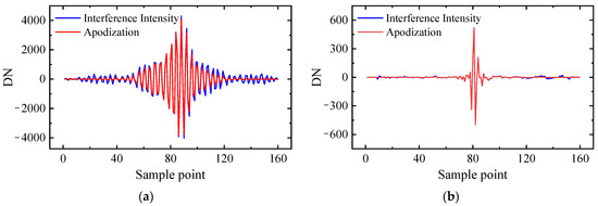 Apodization of interferometric intensity sequence of (a) broad-band interference channel; (b) high-resolution interference channel.
