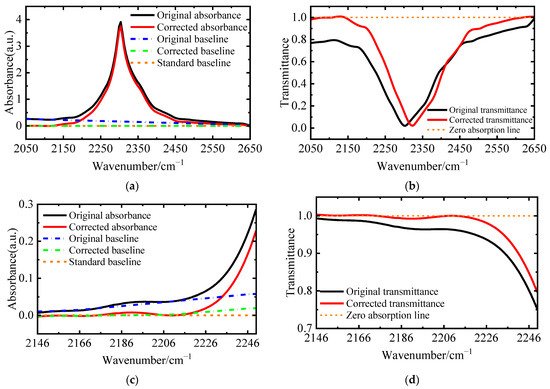 The Forman convolution method [38], which has a good correction effect on linear and nonlinear phase errors, is used for phase correction. According to the different effective interference lengths of the dual-interference channels, the small bilateral interferometric intensity sequence of different sizes [39] with high SNR near the zero OPDs is selected to calculate the phase modulation function and convolves with the original interferometric intensity sequence to complete the phase correction (The small bilateral sampling points of the broad-band interferometric intensity sequence and the high-resolution interferometric intensity sequence are 32 and 16 sampling points, respectively). Ic(δ) is the interferometric intensity sequence after phase correction; as shown in Figure 11, the zero OPDs offset error and asymmetric distortion have been significantly improved.