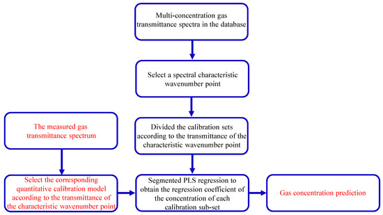 The total multi-concentration calibration set of each gas is divided into four concentration calibration sub-sets according to the transmittance threshold of the spectral characteristic wavenumber points, and the transmittance and concentration of each spectral point in the sub-sets are modeled using partial least squares regression, and the concentration prediction model of each gas is established. R2 is used as the model accuracy evaluation function, as shown in Equation (29). The closer the value is to 1, the more accurate the model prediction is.