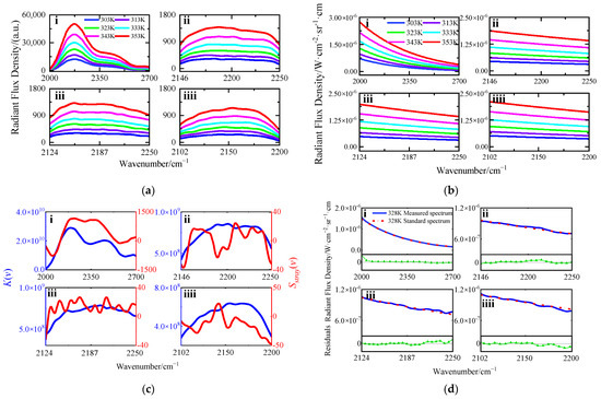 (a) Reconstructed DN spectrum of each temperature sampling point; (b) theoretical radiance at each temperature sampling point; (c) radiometric calibration coefficients; (d) the radiance and calibration residual after calibration at 328 K temperature point. The serial numbers i, ii, iii, and iiii correspond to the broad-band interference channel and the high-resolution interference channel 1st, 2nd, and 3rd.