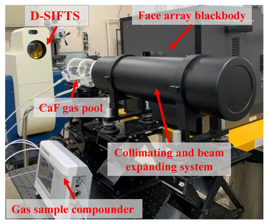The gas passive telemetry simulation system was built in the laboratory. The dual-interference channel gas detection experiment was carried out using D-SIFTS, as shown in Figure 22. A face array blackbody infrared radiation light source was used as a background, and the emitted flat-field radiation light passes through the collimator at the entrance pupil of the D-SIFTS. After collimating and expanding the beam, it enters the CaF2 gas pool full of the target gas with a length of 30 cm and a bottom diameter of 10 cm, and finally, it goes through the front imaging system into the D-SIFTS.