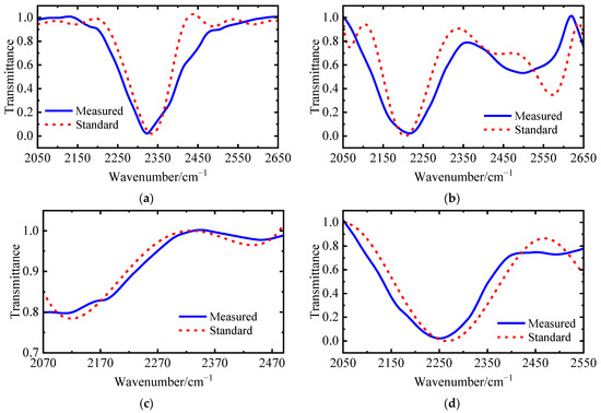 (a) 10%CO2 transmittance spectrum; (b) 10%N2O transmittance spectrum; (c) 1%CO transmittance spectrum; (d) mixed gas transmittance spectrum.