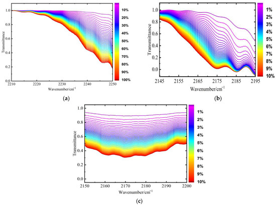 Then, according to the gas types, the standard transmittance spectra in the characteristic absorption waveband corresponding to 50 different concentration sampling points of each gas are selected as the total concentration calibration set in the HITRAN database, as shown in Table 7 and Figure 25. The spectral resolution is set to 4 cm−1, and the optical path is 0.3 m.