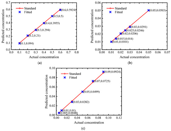 F is the number of samples in the calibration set, cpredicted is the predicted concentration of the model, ctrue is the sample concentration, and ctrue is the average sample concentration. The specific conditions of the segmented concentration quantitative correction model of each gas are shown in Table 8.