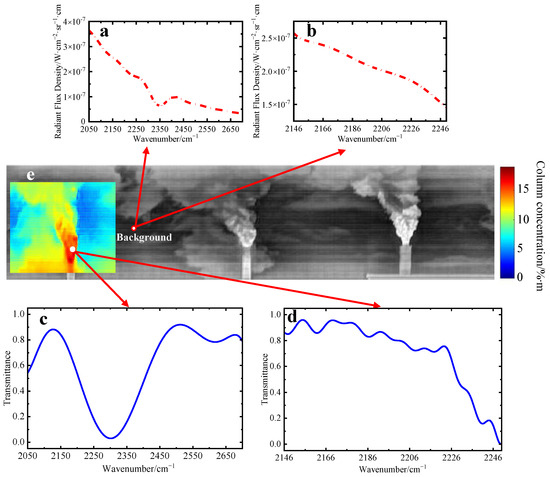 By scanning the target area, the three-dimensional interferogram data cubes of the dual-interference channels of the target scene are obtained. Then, the infrared image of the target scene is obtained via scene image reconstruction. A point in the plume emission area is selected for spectral reconstruction to obtain the transmittance spectrum (the gas plume temperature can be obtained in real time from the measured spectrum [42], which is about 68 °C, and the background radiance can be replaced by the measured radiance of the sky point with a similar position, as shown in Figure 28a,b), as shown in Figure 28c,d. Then, the gas transmittance spectrum of the high-resolution interference channel 1st corresponding to each point in a chimney’s gas plume emission area is reconstructed, and the CO2 concentration of each point is inverted by using the quantitative correction model of gas concentration. After registration and fusion of the concentration distribution information and the infrared scene image, the pseudo-color display is performed to realize the spatial visualization of the gas component concentration, as shown in Figure 28e. This area’s maximum CO2 column concentration is about 11.26%∙m, which fits well with the situation [43].