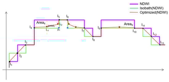 - Form two trajectories: one trajectory is the isobath (from above Step 4), and another trajectory is the initial waterline (Step 3). Apply the proposed area-based optimization algorithm to minimize the area of differences in the above two trajectories. The optimized waterline acts as the final waterline.