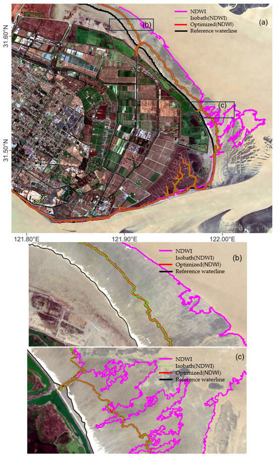 - Optimized (NDWI): the final waterline after optimizing the initial NDWI waterline and isobath (NDWI) using the area-based optimization algorithm;