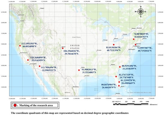 We carefully handpicked study areas within the United States of America (USA), strategically covering the southeast, northwest, and central regions, thus ensuring an exhaustive representation of the USA’s primary agricultural field types and various forms of UGSs (Figure 1). In our research, we employed remote sensing imagery of varying resolutions. This study site selection was also based on the availability of multi-sensor and multiresolution datasets for the ARSI and UGS types. Thus, we managed to ensure that our resolution spectrum encompassed 0.5 m, 1 m, 3 m, 10 m, 20 m, and 30 m per pixel resolution images acquired from various aerial and spaceborne platforms. The availability of very high-resolution images also allowed for visual accuracy assessment of the segmentation process. For the 10 m images, we used Sentinel-2 Multispectral Imager (MSI) data, while for 30 m resolution images, we used data from Landsat 8 Optical Imager (OLI). While testing the impact of spatial resolutions on the segmentation results, it is important to keep the spectral bands constant across the images. Therefore, to ensure the incorporation of relevant spectral information in the used RGB bands and avoid combinations of spectral images of different bands affecting the test results, we employ the 10 m resolution bands for further resampling to the 20 m data. Meanwhile, the 0.5 m and 1 m images were obtained from the USGS archive of very high spatial resolution aerial images. Our 3 m resolution PlanetScope remote sensing images were procured from Planet’s official website (https://www.planet.com/, accessed on 16 December 2023), which offers global high-resolution imagery at 3 m resolution. Detailed data attributes and access links can be found in Table 1.