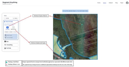 SAM is currently freely accessible for use, and its source code has been made open access. Utilizing SAM for image segmentation is remarkably straightforward. The model comprises two primary functions: The first method involves the interactive and manual selection of target points or the utilization of various input prompts, such as clicks, selected boxes, and text. This approach leverages a form of approximate supervised learning to achieve precise image segmentation with a minimal amount of sample data, as depicted in Figure 2. The second method is more automated and requires minimal user intervention. In this approach, the model autonomously completes the image segmentation process. The model is processed by the mask decoder [], delivering results that are illustrated in Figure 3. The segmented portions can be readily exported, and each segmented image is stored within the model, as demonstrated in Figure 4. This object-oriented image segmentation significantly enhances the processing capabilities for ARSI and UGS images. Both segmentation methods are notably efficient, typically requiring only a brief processing time, which may vary depending on computer performance and the size and resolution of the image.