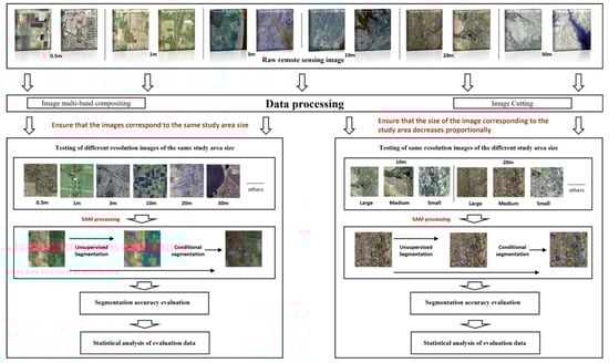 This study delves into the feasibility of employing SAM for diverse types of remote sensing data segmentation, encompassing various stages such as data preprocessing, segmentation, accuracy evaluation, data analysis, and more. The comprehensive operational workflow is elucidated in Figure 5. In preparation for image segmentation, preliminary data preprocessing is essential for the original images. Due to variations in data acquisition methods, distinct types of data necessitate separate processing approaches. For high-resolution remote sensing images, such as 0.5 m, 1 m, and 3 m, RGB bands were used for segmentation. In the case of 10 m and 30 m resolution remote sensing images, bands 2, 3, and 4 were combined to generate three-band RGB images. Beyond data fusion, to facilitate a more systematic evaluation, we have categorized the data into two distinct types:
