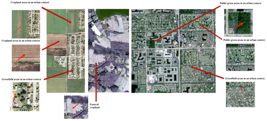 Upon completing the data preprocessing, the data can be systematically input into the SAM for segmentation testing. We employ two segmentation methods, condition-based segmentation and unsupervised segmentation, to assess and compare the segmentation results across various types of scenarios depicted in Table 2 and Table 3. Conditional-based segmentation, also recognized as a form of approximate supervised learning as described above, accomplishes region-of-interest extraction through interactive clicks, offering minimal samples for model training. Unsupervised classification takes a more direct approach, relying on the pre-trained model to automatically select sample points for image segmentation and extraction. This is why certain images may resemble those obtained through the conditional segmentation of labeled points. Following the segmentation process, we can then extract and merge our regions of interest in the subsequent results. To obtain a holistic grasp of SAM’s segmentation capabilities concerning cultivated land and UGSs, simultaneous tests were conducted for general cropland, urban public green space areas, peri-urban cropland, and urban green belts, and these four types of segmentation can be referred to as shown in Figure 6. Nearly ten images of each category were examined, with efforts made to ensure that each image accurately represented the local land use distribution.