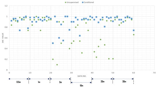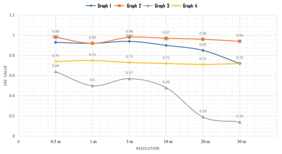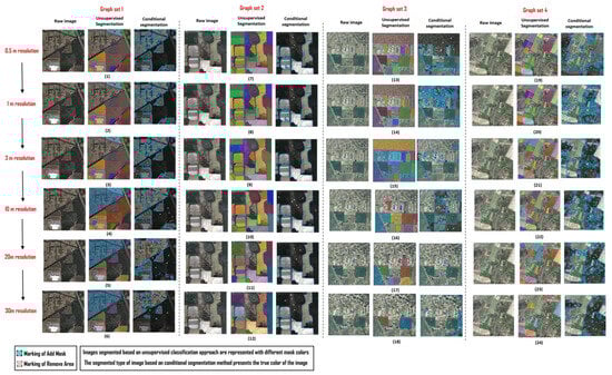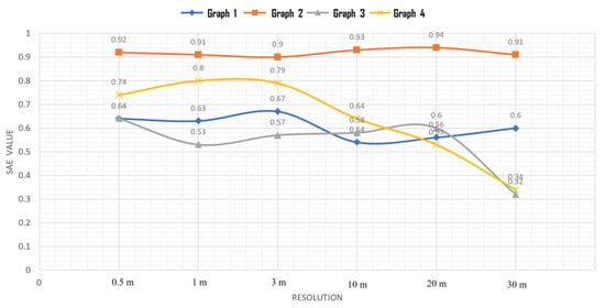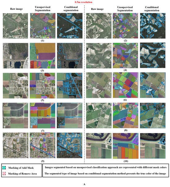 The detailed image segmentation results are presented in Figure 7, Figure 8, Figure 9, Figure 10, Figure 11 and Figure 12, showcasing the segmentation outcomes at resolutions of 0.5 m, 1 m, 3 m, 10 m, 20 m, and 30 m. Both conditional-based segmentation and unsupervised segmentation results are depicted individually. Table 4 provides the segmentation accuracy values for each image. Overall, SAM exhibits robust segmentation capabilities, regardless of whether it is applied to high-resolution or low-resolution ARSI and UGS images. As illustrated in Figure 13, we provide a visualization of all the SAE values. The accuracy of conditional-based image segmentation is consistently high, with the majority exceeding 0.9. In contrast, unsupervised classification methods exhibit sensitivity to image resolution, particularly underperforming on low-resolution images (3 m and above), where approximately 35% of the images experience a decline to 60% or even lower accuracy. It also suggests that resolution had less impact on conditional segmentation in SAM, whereas, for unsupervised segmentation, higher resolutions showed better segmentation accuracy. This observation indicates that, in practice, resolution has a relatively limited impact on the segmentation effectiveness of conditional segmentation in SAM. It is worth noting that unsupervised segmentation, while generally effective, has some segmentation results below 0.4, indicating its comparative limitations in certain scenarios. While SAM generally showcases robust segmentation capabilities, excelling in delineating cultivated areas with distinct boundaries and public green spaces within urban environments, it encounters challenges with certain image types, resulting in performance issues, such as overfitting. Typically, when annotating a substantial amount of contextual sample information for specific images, the segmentation effectiveness improves, as demonstrated in Graph 8 in Figure 10. However, some images exhibit a counterintuitive trend, where increasing annotations leads to a decrease in segmentation accuracy, as observed in Graph 6 in Figure 10, Graph 10 in Figure 8, and several others. These problematic images share a common issue—during the segmentation of the region of interest, they tend to distribute a significant number of extraneous elements, manifesting as sporadic features of other types. Alternatively, they may exhibit a distribution with closely related colors, as illustrated in Graph 4 in Figure 9. This underscores the limitations of SAM in handling more complex remote sensing images in certain segmentation scenarios.