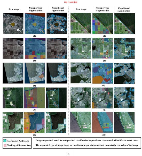 The 3 m resolution test results for different images. Graphs 2, 3, 4, 5, 6, 7, 8, 9, and 10 in dataset C were utilized to extract general cropland areas, while Graph 1 was dedicated to extracting public green areas in an urban context. Different colors in the Unsupervised panel represent different segmentation polygons.