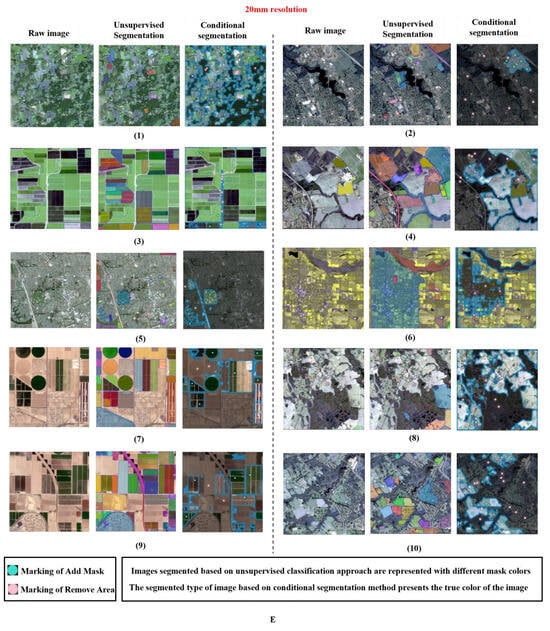 The 20 m resolution test results for different images. Graphs 1, 3, 7, 8, and 9 in dataset E were utilized to extract general cropland areas, while Graphs 2 and 5 were dedicated to extracting public green areas in an urban context, and Graphs 4 and 10 were dedicated to extracting cropland areas in an urban context. Different colors in the Unsupervised panel represent different segmentation polygons.