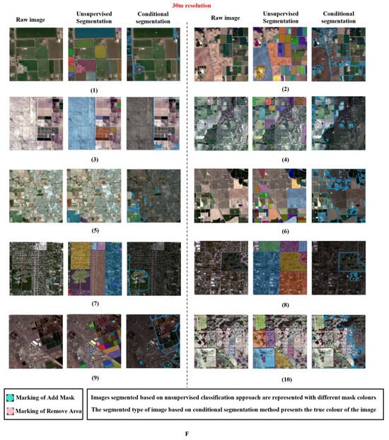 The 30 m resolution test results for different images. Graphs 1, 2, 3, 4, 6, and 10 in dataset F were utilized to extract general cropland areas, while Graphs 5, 7, 8, and 9 were dedicated to extracting public green areas in an urban context. Different colors in the Unsupervised panel represent different segmentation polygons.