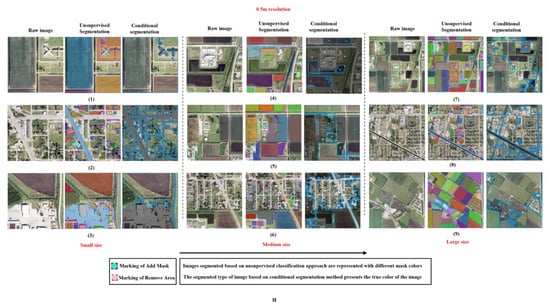 The 0.5 m resolution image test results for different sizes. Graphs 1, 4, 5, and 7 in dataset H were utilized to extract general cropland areas, while Graphs 2, 6, and 8 were dedicated to extracting greenfield areas in an urban context, and Graphs 3 and 9 were dedicated to extracting cropland areas in an urban context. Different colors in the Unsupervised panel represent different segmentation polygons.