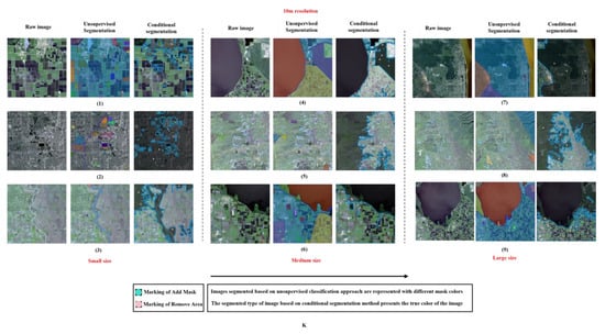 The 10 m resolution image test results for different sizes. Graphs 1, 3, 7, 8, and 9 in dataset K were utilized to extract general cropland areas, while Graph 2 was dedicated to extracting public green areas in an urban context, and Graphs 4, 5, and 6 were dedicated to extracting cropland areas in an urban context. Different colors in the Unsupervised panel represent different segmentation polygons.