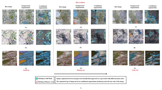 The 20 m resolution image test results for different sizes. Graphs 1–9 in dataset L were utilized to extract general cropland areas. Different colors in the Unsupervised panel represent different segmentation polygons.