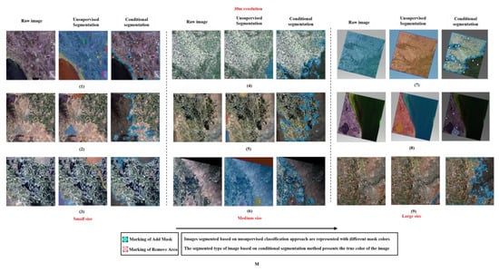 The 30 m resolution image test results for different sizes. Graphs 1–9 in dataset M were utilized to extract general cropland areas. Different colors in the Unsupervised panel represent different segmentation polygons.