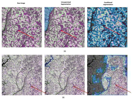 Figure 26. Comparison of segmentation performance of noisy plowed fields on different resolution images. Graph 1 illustrates the segmentation results at a resolution of 0.5, and Graph 2 depicts the results at a resolution of 10 m. As indicated by the arrows on the graph, there is a small amount of woodland within the cropland area. These woodlands can be accurately segmented using a small number of sample points on the high-resolution image. However, for the low-resolution image, even with an ample number of sample points added, the result is not satisfactory. The red arrow points to the region we need to segment out.