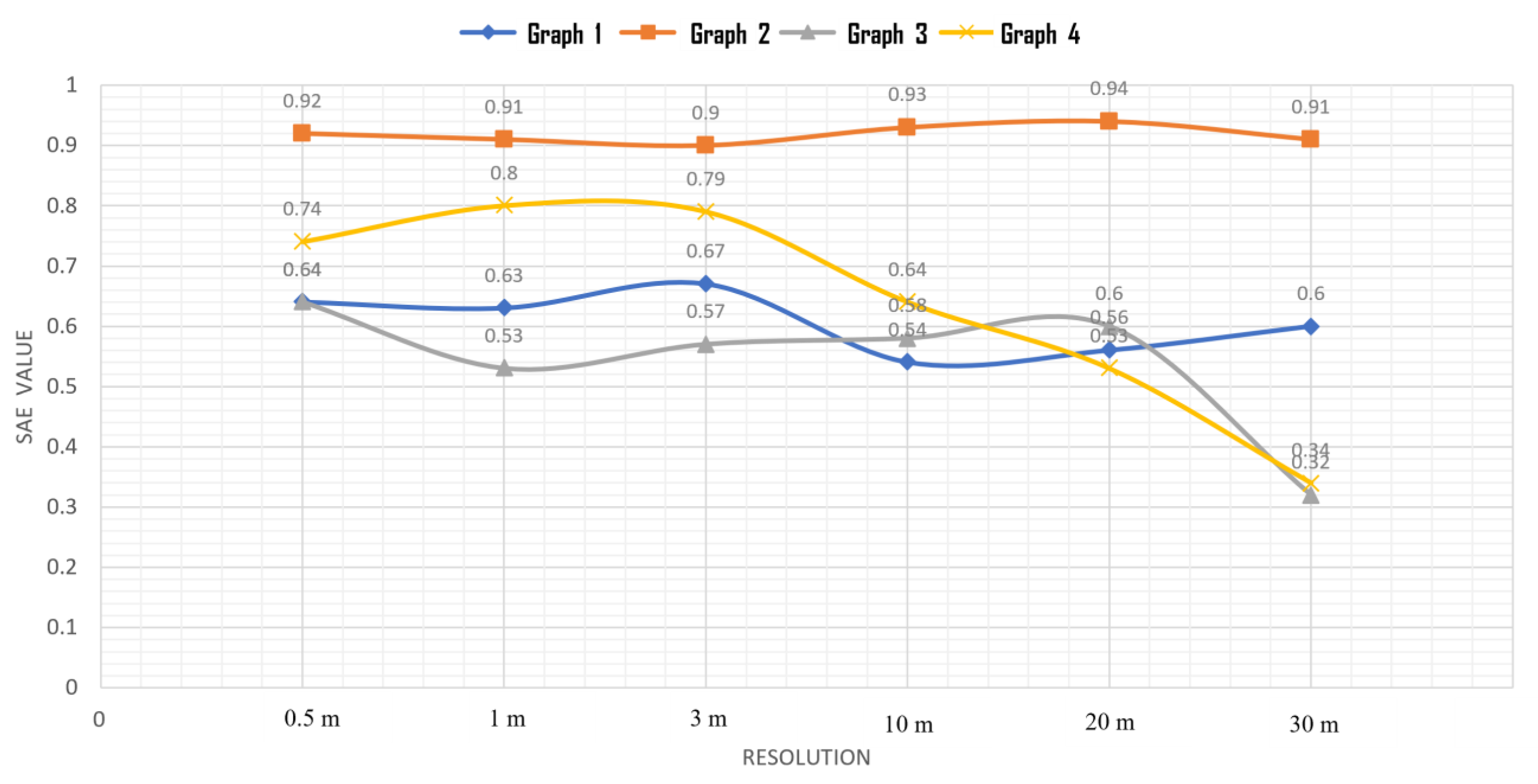 - Evaluation of SAM results for images of different study areas at the same spatial resolution.