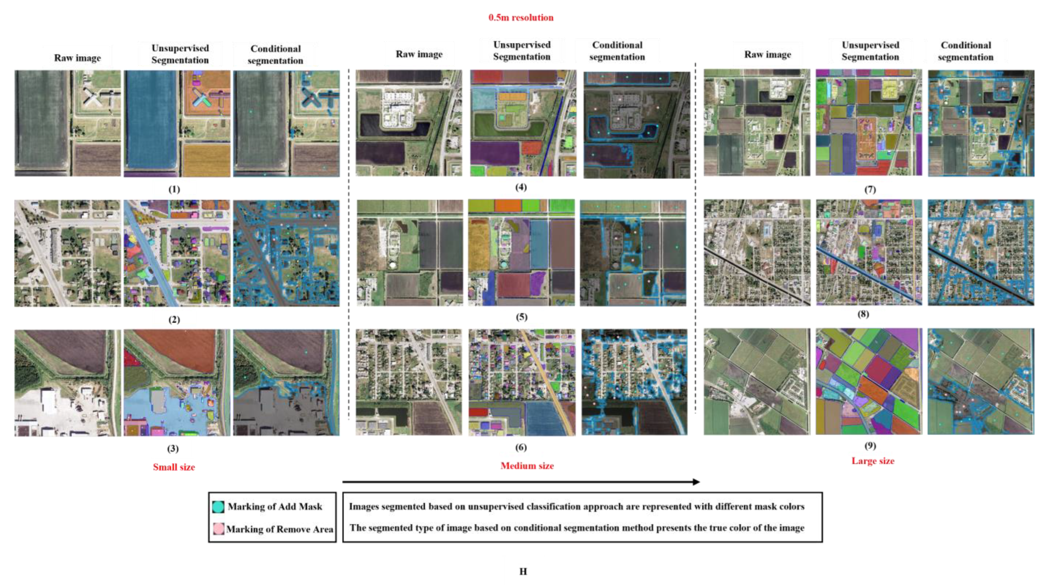 We chose a diverse array of scenarios for testing to assess the generalization capability of SAM-based segmentation for ARSIs and UGSs. To assess the suitability of SAM’s segmentation for various image types, we systematically controlled two variables, namely resolution and study area size. The following sections summarize the main results of our segmentation.