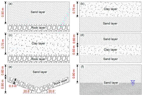 Six stratigraphic models: (a) sand–rock model; (b) clay–sand model; (c) clay–rock model; (d) interbedded clay model; (e) inclined sand–rock model; and (f) sand model with a water table.
