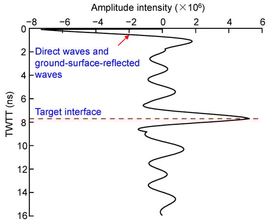 After denoising, the spatial locations of target interfaces can be interpreted according to the two-way travel time (TWTT) and the changing amplitude of the reflected wave. The TWTT is the propagation time of the reflected wave. The unit of the TWTT is nanosecond (ns). The TWTT of the target interface is obtained from processed GPR data. The amplitude intensity is a physical parameter indicating the amplitude value of the reflected wave. The amplitude intensity of the reflected wave is usually expressed in terms of electric or magnetic field strength. In this study, the variation in amplitude is expressed in a non-dimensional manner, which only indicates the relative magnitude. One trace of the reflected wave at a given location corresponds to one-dimensional GPR data, as shown in Figure 2. When an electromagnetic wave encounters a stratigraphic interface, the amplitude of the reflected wave will increase; hence, the location of peak amplitude corresponds to the depth of the target interface.