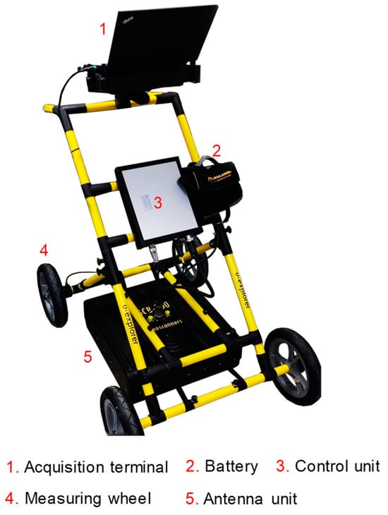 The GPR equipment used in this study is an AKULA 9000C high-precision GPR from Geoscanners Company, Boden, Sweden, which was also adopted by Rasimeng and Mandang []. According to the information provided by the manufacturer of the equipment, it is known that the equipment has an analog bandwidth frequency of 5–4000 MHz, a pulse repetition frequency of 12.5–200 kHz, a scan rate of 1–330 tracks/s, a sample size of 128–8192, and a time window range of 6.4–32768 ns. The equipment includes an integrated antennae unit, a control unit, a data acquisition terminal, a battery, and a measuring wheel, as shown in Figure 3. The equipment has a resolution of 2.5–50 cm and a detectable depth of more than 0.2 m. The resolution of identification of GPR is positively related to the antenna frequency, while the maximum depth of penetration of GPR is negatively related to it. When the resolution of the device is smaller than the minimum thickness of strata, the interpreted depth increases with decreasing antenna frequency. Thus, operating frequency is always a trade-off between resolution and penetration. Since the electrical conductivity of the ground, the transmitted center frequency, and the radiated power all may limit the effective depth range of GPR investigation, there is no strict quantitative relationship between depth and frequency. In this study, the maximum depth of stratigraphic interfaces is smaller than 1.5 m in the experimental test, thus, an antenna with a main frequency of 400 MHz was utilized. For field study, the depth values of the strata are often large. Therefore, an antenna with a main frequency of 100 MHz was chosen.