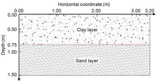 The clay–sand model, with a horizontal interface (see Figure 4), illustrates the interpretation of GPR data. The model consisted of two layers. The material of the upper layer was Kaolin clay, with a thickness of 0.75 m. The clay had a particle size of no more than 0.02 mm. The plastic and liquid limits were 40% and 68%, respectively. The optimum moisture content was 36%, and the maximum dry density was 1.3 g/cm3. The sand material used in this study had a maximum dry density of 1.9 g/cm3. The compaction degree of the clay and the sand in the experiments was about 80%. From Equation (1), the soil compaction does not affect the final interpreted depth.