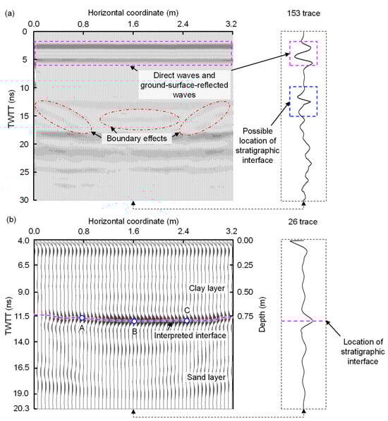 As shown in Figure 5a, the raw GPR data of the clay–sand model include direct waves, ground-surface-reflected waves, and interference waves. The boundary effect is negligible. The distance between the antenna and the ground surface is identified by zero-time correction. Subsequently, the energy of the interference waves is suppressed using Ormsby band-pass filtering, horizontal low-pass filtering, and stacking. The reflected waves at the horizontal coordinate of 1.6 m in the original and interpreted data are extracted, which correspond to the 153 trace of reflected wave data in the original data and the 26 trace of reflected wave data in the interpreted data, respectively. In Figure 5, the signal-to-noise ratio is obviously improved after the denoising technique, which makes the reflected waves at the stratigraphic interface clearer and facilitates the identification of the stratigraphic interface. The processed GPR data are shown in Figure 5b. The TWTT of the reflected waves between the ground surface, and the clay–sand interface is approximately 7.5 ns. As per Figure 5b, the shape of the reflected waves of the clay–sand interface is clear, continuous, and horizontal, which is consistent with that of the clay–sand interface of the physical model. This reveals that GPR can identify the clay–sand interface.