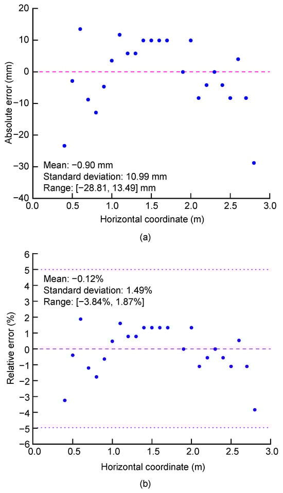 Taking the clay–sand model displayed in Figure 4 as an example: The depths were measured at 25 locations with an interval of 0.1 m. The 15th location, with a horizontal coordinate of 1.8 m, was selected to back-calculate the relative permittivity of the clay layer. The outcome of the calculation is 3.35. The absolute and relative errors of the other 24 locations are then computed and plotted in Figure 6. The absolute error ranges within [−28.81, 13.49] mm, with a mean of −0.90 mm and a standard deviation of 10.99 mm. The relative error ranges within [−3.84%, 1.87%], with a mean of −0.12% and a standard deviation of 1.49%. A relative error lying between ±5% is generally satisfactory in geotechnical engineering.