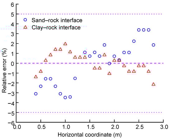 For each model of the stratigraphic interface, the depths were measured at 25 equally spaced locations with horizontal coordinates ranging from 0.4 m to 2.8 m. The 10th and 12th locations were chosen to back-calculate the relative permittivity for the sand–rock and clay–rock models, respectively. The two locations near the center of the model box are selected to avoid the weak influence of boundary effects. The results are 4.88 and 3.31, respectively. For the sand–rock model, the 15th and 20th positions for supplementary calculation are picked. Their results of the relative permittivity are 4.87 and 4.88. Accordingly, the mean value is 4.88, which is equal to that of the 10th position. For the clay–rock model, the 18th and 24th positions for additional calculation are selected. Their results of the relative permittivity are 3.31 and 3.33; in addition, the mean value is 3.32, which is approximately equal to that of the 12th position. For the sand–rock model, the range of absolute error is [−31.04, 30.07] mm, with a mean of 0.14 mm and a standard deviation of 19.87 mm. The range, mean, and standard deviation of the relative error are [−3.49%, 3.38%], 0.02%, and 2.23%, respectively. The relative error is plotted in Figure 8 against the horizontal coordinate of measured locations. For the clay–rock model, the absolute error lies between −16.22 mm and 14.39 mm, with a mean of 0.07 mm and a standard deviation of 7.42 mm. The range, mean, and standard deviation of the relative error are [−2.16%, 1.95%], 0.01%, and 1.00%, respectively. The above results indicate that the GPR can identify the sand–rock or clay–rock interfaces with adequate accuracy.