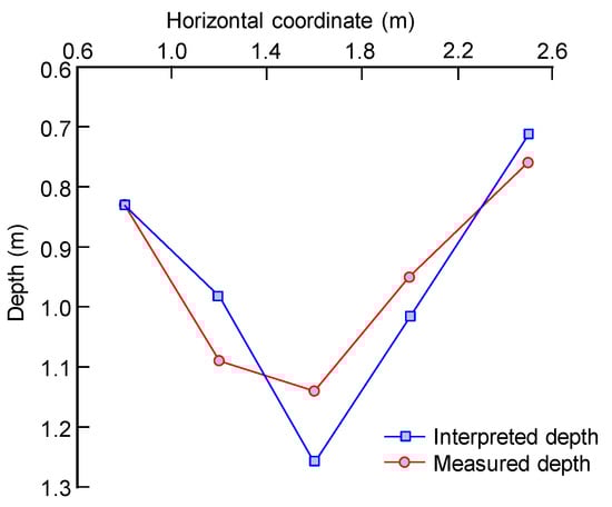 The depths of five locations with horizontal coordinates of 0.8 m, 1.2 m, 1.6 m, 2.0 m, and 2.5 m were measured. The first location was used to back-calculate the relative permittivity of the sand layer, which is calculated as 3.22. The measured and interpreted depths of the selected locations are plotted versus their horizontal coordinates, as shown in Figure 9. For the latter four locations, the range, mean and standard deviation of absolute error are [−107, 119] mm, 8.7 mm, and 104 mm, respectively. The range of the relative error is [−9.86%, 10.48%]. Compared with the horizontal sand–rock model, the accuracy in identifying the V–shaped model is reduced. For the third location close to the intersection, the absolute and relative errors are −119 mm and 10.4%, respectively. Although the graph of the reflected waves from the area near the intersection is relatively blurred, the accuracy of the identification at these locations is still acceptable in engineering practice.