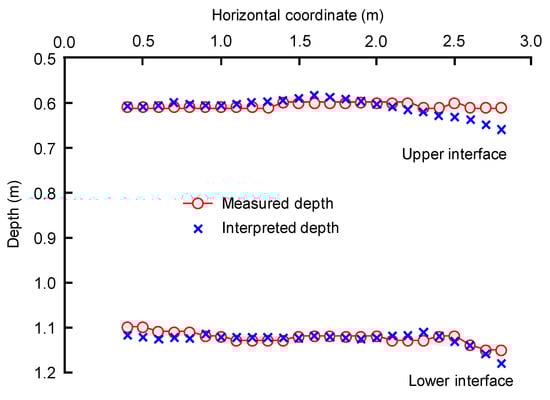 For each interface, the depths of 25 locations were measured, with horizontal coordinates ranging from 0.4 m to 2.8 m. The 25 locations were equidistantly distributed. The depths of the 17th and 11th locations were used to back-calculate the relative permittivity of the upper sand layer and the clay layer, respectively. The results are 7.09 and 5.79, respectively. Figure 10 shows the measured and interpreted depths of the two interfaces. The interpreted values are in good agreement with the measured values.