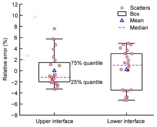 The scatters and box plots of the relative errors for the two interfaces are displayed in Figure 11. The range of the relative errors for the upper interface is [−3.29%, 7.59%], and [−5.29%, 4.96%] for the lower interface. The range, mean, and standard deviation of absolute errors for the upper interface are, respectively, [−19.7, 46.3] mm, 0.16 mm, 17.8 mm, and [−27.5, 24.3] mm, 0.98 mm, 18.3 mm for the lower interface. Based on the above statistics, the GPR can identify the interbedded clay layer with high accuracy. In addition, the difference between the 25% quantile and 75% quantile values is smaller for the upper interface than that for the lower interface. Since a flatter box and a smaller standard deviation stand for a more concentrated relative error and a more stable result of identification, the accuracy of identification of the GPR for the upper interface is higher than that for the lower one.