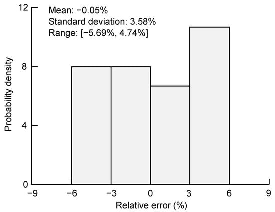 The depth values were measured at 25 equally distributed locations along the interface, with the horizontal coordinates ranging from 0.4 m to 2.8 m. The depth of the 14th location was then used to back-calculate the relative permittivity of the wet sand layer, and the result was 6.98. The range of the absolute error is [−51.2, 41.2] mm, with a mean of −0.84 mm and a standard deviation of 31.7 mm. Figure 12 shows the histogram and statistics of the relative errors. The range of relative errors is narrow, and the mean is close to zero, indicating that the GPR has satisfactory performance in identifying the water table interface in a sand layer.