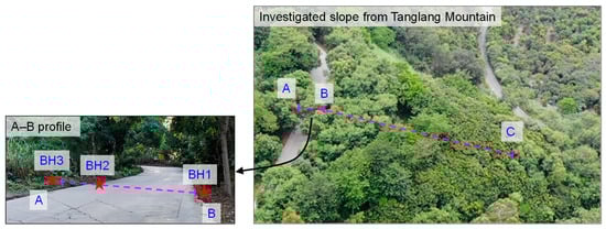 The investigated slope is located in Tanglang Mountain in China, as shown in Figure 13. For this slope, three boreholes are available along profile A–B, denoted by BH1, BH2, and BH3 in Figure 13. The three holes were drilled at the same level. The horizontal spacing between BH1 and BH2 is 8 m. The horizontal spacing between BH2 and BH3 is 4 m. Drilling was completed when the weathered granite layers were encountered. No stable water table was encountered during drilling. The borehole information reveals that there are two strata consisting of clayey gravel and weathered granite. The depths of the stratigraphic interface at BH1, BH2, and BH3 are 15.76 m, 13.87 m, and 15.63 m, respectively. The horizontal length of survey profile A–B is 12 m. The survey profile B–C is at the slope with a length of 52 m. The GPR investigation starts at A and moves along the survey profile to C to detect the strata. The time window of the GPR system is set to 300 ns. The correction value of the measuring wheel, the preset range of the relative permittivity, the acquisition mode, and the number of sampling points parameters are the same as that in the above model experiments.