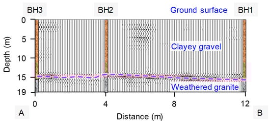 The interpreted GPR data for profile A–B are shown in Figure 14, in which the continuous reflected waves are demonstrated as the blue dashed line. The TWTT value of the interface at BH1 is 248.47 ns. According to Equation (2), the relative permittivity of the clayey gravel is 5.59. The TWTT values of the interface at BH2 and BH3 are 226.87 ns and 234.18 ns, respectively. Then, the depth of the interface for the boreholes BH2 and BH3 can be calculated using Equation (1). The calculated depth at BH2 is 14.39 m, which is 0.52 m deeper than the measured value and the relative error is 3.7%. The calculated depth at BH3 is 14.86 m, which is 0.77 m lower than the measured value and the relative error is −4.9%. In geotechnical engineering, an accuracy level of ±20% or less relative error is acceptable [,,]. Thus, the accuracy of the GPR technique is good in the field for identifying subsurface strata.