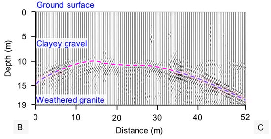 For the survey profile B–C, the reflected waves reveal two layers in the slope, as shown in Figure 15. The depth of the interface lies in the range of [15.76 m, 17.79 m] for this slope. The interface between the two layers can be determined continuously with a pattern of convexity toward the slope surface. The interpreted interface from 10 to 30 m is approximately parallel to the slope surface. According to the interpreted GPR data, the strata profile of the slope can be determined, as shown in Figure 16. The stratigraphic interface exhibits an irregular pattern with detailed changes between the boreholes that can be perfectly captured. The depth of each location along the interface between the two layers can be quantified accurately. In contrast to the conventional borehole survey methods, which only provide information at limited locations, the GPR technique is a promising option for identifying the continuous profiles of the subsurface strata with satisfactory accuracy in the field.