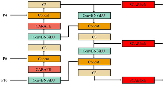 We added two Swim-Transformer modules to the backbone’s deep network and renamed them STR modules. Compared with the extraction of simple features of SAR ship targets in shallow networks, we expect to extract the semantic features of the entire SAR image in deep networks so that ship targets can be detected from complex backgrounds more effectively. Therefore, we use the STR module in the deep network and keep the original C3 module in the shallow network. In addition, we introduce the SCA mechanism module after establishing the STR module to enhance the network’s feature extraction ability for local information in the images. The SCA module considers both the position relationship and channel attention in the SFE backbone. This allows us to accurately capture the region of interest by utilizing the captured position information effectively, while also capturing the relationship between channels. Compared with the SE module and the CBAM module, the SE module only considers spatial attention, the CBAM module separates spatial attention and channel attention, and the design of SCA is more suitable for SAR image ship detection tasks.