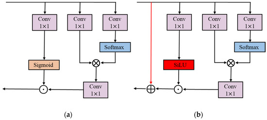 Finally, before object detection of feature maps of three different scales, the context aggregation module SCABlock is added to further enhance the features by learning the global spatial context of each scale. SCABlock is an improved version of CABlock used by Liu [46] in optical remote sensing image instance segmentation tasks, as shown in Figure 6. As shown in the figure, there is a clear difference in the structure of the two modules. SCABlock has an extra layer of shortcut connection than CABlock, and the Sigmoid activation function in the original position is replaced by the SiLU activation function. The shortcut connection is added to effectively fuse local and global features before SAR ship detection, reduce information confusion, enhance feature extraction of feature maps of different scales, alleviate the problems of multiscale and insufficient features of ship targets, and improve the accuracy of ship target detection in SAR images.