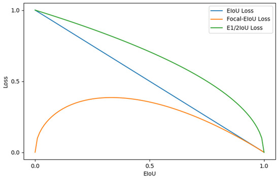 Function graph comparison of EIoU Loss, Focal-EIoU Loss, and IoU Loss.