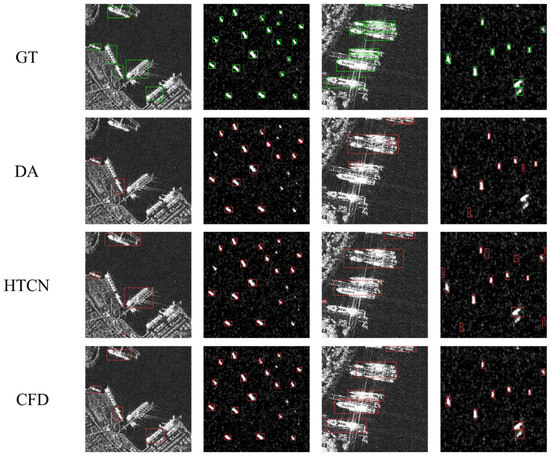 SAR image background noise is a major factor affecting SAR ship detection. In order to verify the robustness of CFD proposed by us, we added Gaussian noise, salt and pepper noise and random noise to test images, respectively, and compared the performance of CFD and existing unsupervised domain adaptation methods under these three background noises. The experimental results are shown in Table 6. The analysis of the experimental data in the table shows that, in the three background noises, the map obtained by CFD is the highest. In particular, in the case of Gaussian noise, the map obtained by CFD is 15.72% and 8.84% higher than that of DA and HTCN, respectively; in the case of salt and pepper noise, the map obtained by CFD is 15.66% and 10.05% higher than that of DA and HTCN, respectively; in the case of random noise, the map obtained by CFD is 15.35% and 11.21% higher than that of DA and HTCN, respectively. Moreover, we found that the detection performance gap between CFD and DA and HTCN is greater in the case of background noise than that of no background noise. It proves that compared with other unsupervised domain adaptation methods, CFD can better alleviate the impact of background noise on ship detection, which reflects the robustness of CFD.