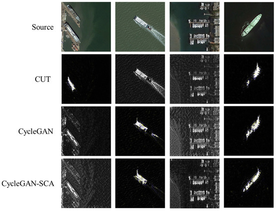 To verify the rationality of CycleGAN-SCA, we compare the results of image conversion in the source domain of other image generation models. The visualization results of various image generation models are shown in Figure 11, where CUT is the image generation method [53]. It can be seen from the figure that CycleGAN and CycleGAN-SCA can correctly identify ship targets in optical images and generate higher quality pseudo-SAR images than CUT image generation models. This shows that in SAR image ship detection, the image generation module based on CycleGAN can effectively mitigate the domain difference between the source domain and the target domain. In addition, the improved CycleGAN-SCA produces ship targets that are closer to the original image in texture and shape than CycleGAN.