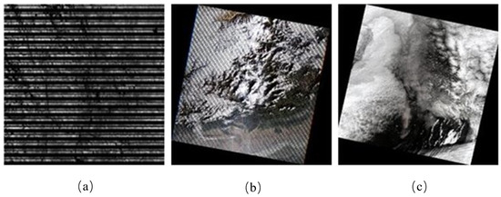 Three instances of remote sensing data that are missing: (a) displays a MODIS instrument failure on the Aqua satellite, which caused about 70% of the data in Aqua MODIS band 6 to be lost; (b) displays a Landsat-7 satellite digital product, where the image had pixel failure due to a malfunctioning Landsat-7 ETM+ on-board scanning line corrector; and (c) displays a Landsat-8 OLI_TIRS satellite digital product that is useless for direct use due to its 87.3% cloud coverage.
