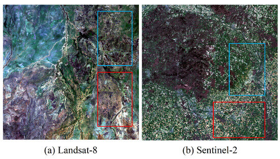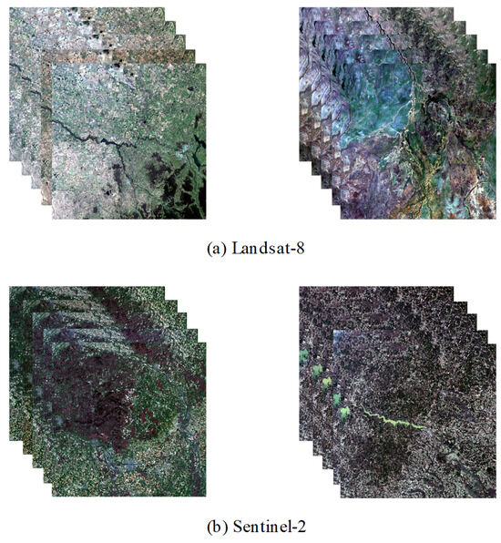 We selected data from two satellites—Landsat-8 and Sentinel-2—consisting of eight and four time series. Their details are given in Table 1 and Table 2, and each time series contains images from five time phases. For the Landsat-8 satellite dataset, we used seven bands: coastal, blue, green, red, near-infrared, short-wave infrared-1, and short-wave infrared-2, all with a spatial resolution of 30 m and a size of 5120 × 5120 per image. Figure 2a shows two examples of time series of the Landsat-8 satellite data. For the Sentinel-2 satellite dataset, we used 8 bands, including blue, green, red, 3 vegetation red edge, near-infrared (wide), and near-infrared (narrow), of which 4 bands, 3 vegetation red edge and near-infrared (narrow), have a spatial resolution of 20 m and a size of 5490 × 5490, and the other bands have a spatial resolution of 10 m and a size of 10,980 × 10,980 per image. The time resolution of the Landsat-8 dataset and the Sentinel-2 dataset is 16 days and 5 days, respectively. Figure 2b shows two examples of time series of the Sentinel-2 satellite data.