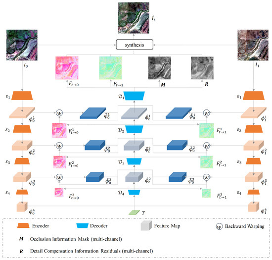The objective of satellite image sequencing is to utilize two time-phase images, and , to interpolate an image for a specific intermediate time phase t, thereby completing the satellite image sequence. We assume that the two time phases are 0 and 1, and the interpolated result is denoted as . The interpolation model can be represented as Equation (1):