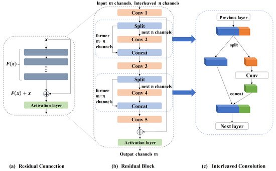 Detailed structure of the residual block used by each sub-decoder. The residual block (b) uses a residual connection (a) as a whole. There are five convolution layers within the residual block, which uses an interleaved convolution (c) at convolution layer 2 and convolution layer 4.