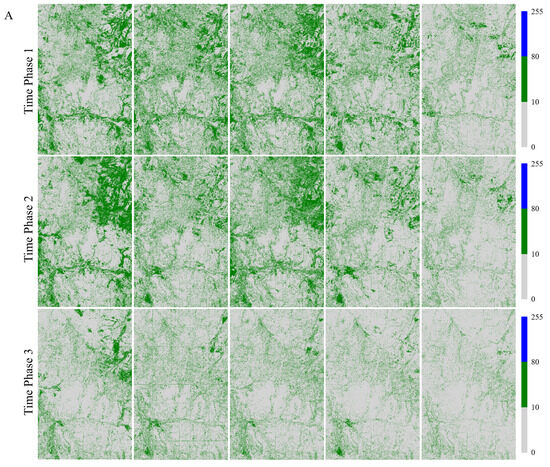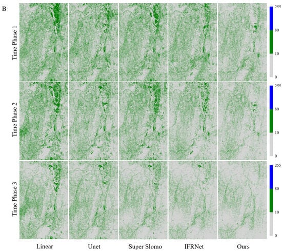 Pixel error map for comparative experiments of Experiment 2 for multi-temporal sequence image interpolation on the Landsat-8 satellite dataset. (A,B) are the results of two time series from Experiment 2 of the Landsat-8 satellite dataset. Time phases 1, 2, and 3 represent the experimental results for the middle three time phases t = 0.25, 0.50, and 0.75. In the pixel error map, grey, green, and blue represent the absolute value of the pixel difference in the ranges 0–10, 10–80, and 80–255, with larger values representing larger errors.